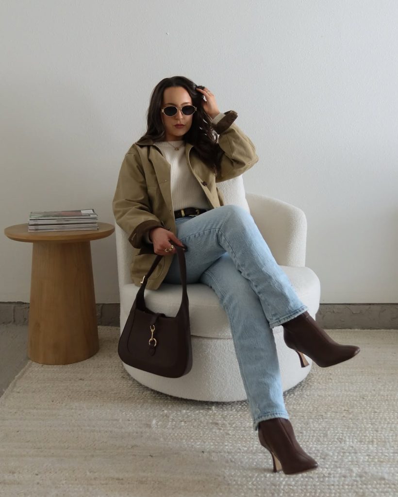 This outfit balances dressy and relaxed, proving denim still plays a role in 2026 trends for early spring.