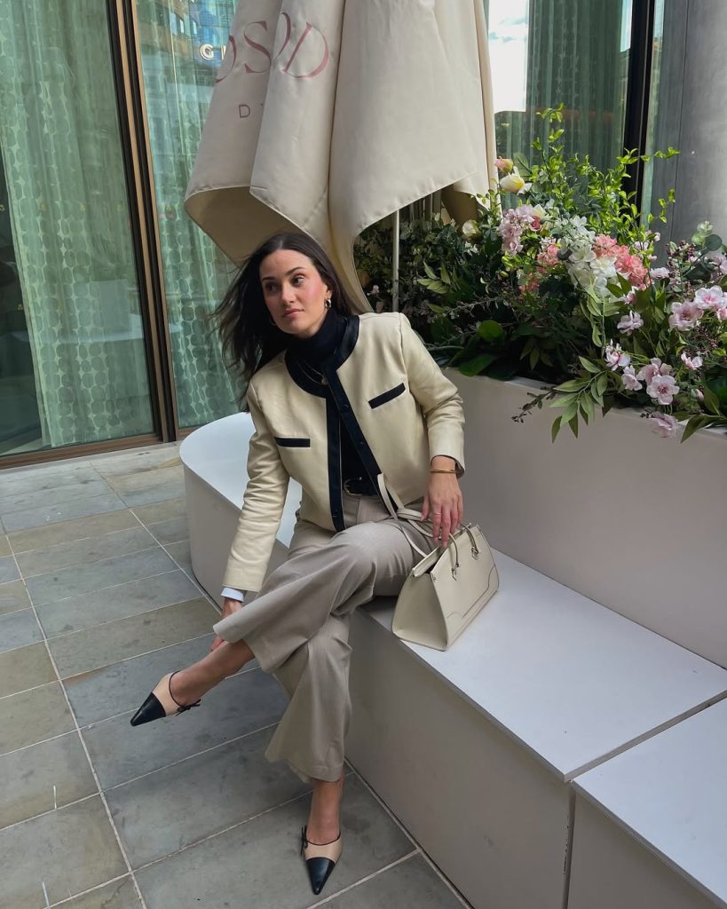 Tailored layers and feminine proportions create a dressy early spring outfit with unmistakable Paris energy.