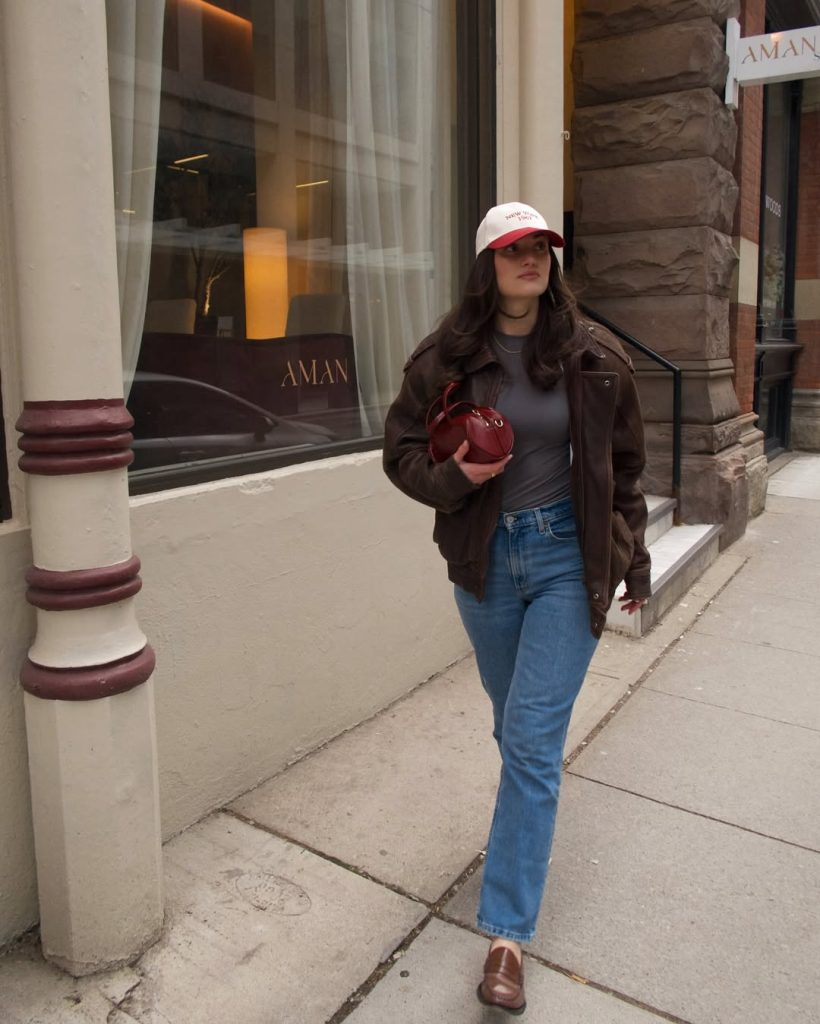 A suede jacket layered over clean basics creates a dressy yet wearable look suited for cold early spring days.