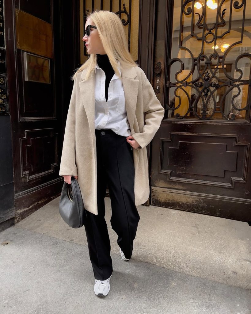 This is ideal for city walks, travel days, or coffee runs when the air is still cold. To enhance it, layer with a lightweight scarf. Avoid overly formal shoes—this look thrives on balance and comfort.