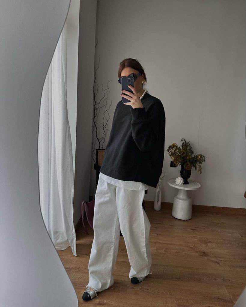 A monochrome palette and soft volumes define this quiet, aesthetic look rooted in modern European minimalism.