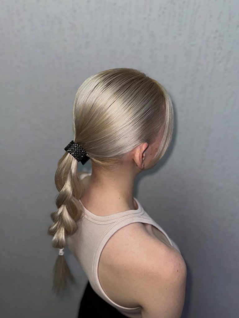 This ultra-sleek bubble ponytail is all about precision and shine. The hair is smoothed tightly against the scalp, then sectioned into evenly spaced bubbles that create a bold, sculptural effect. It feels powerful and modern—perfect if you want an Easter hairstyle that’s polished yet undeniably eye-catching.
