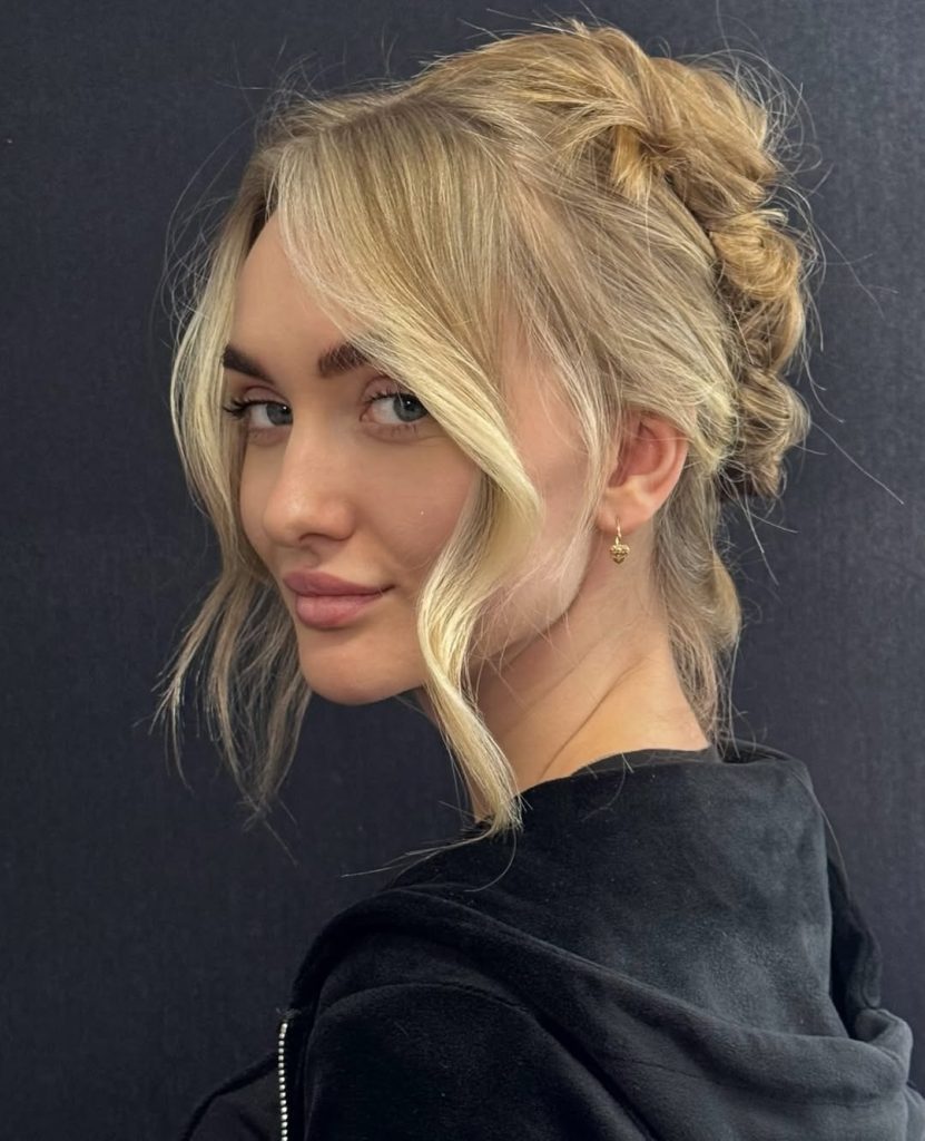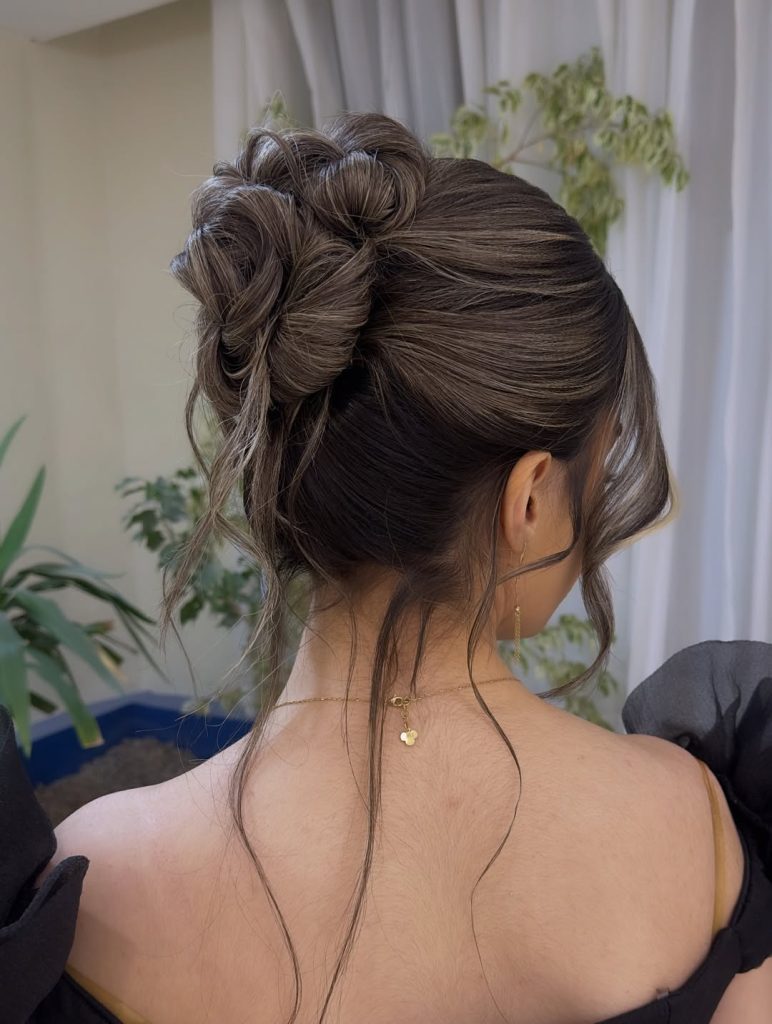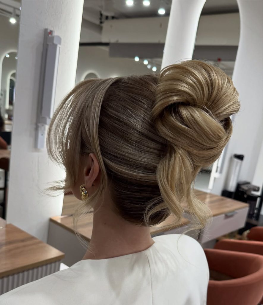 There’s something undeniably confident about a high, voluminous bun. The fullness at the crown lifts everything—your features, your posture, and even your mood. It feels elegant yet slightly playful, like you’re ready for Easter brunch and maybe a few compliments along the way. The soft tendrils around the face keep it from feeling too severe, adding warmth and movement.