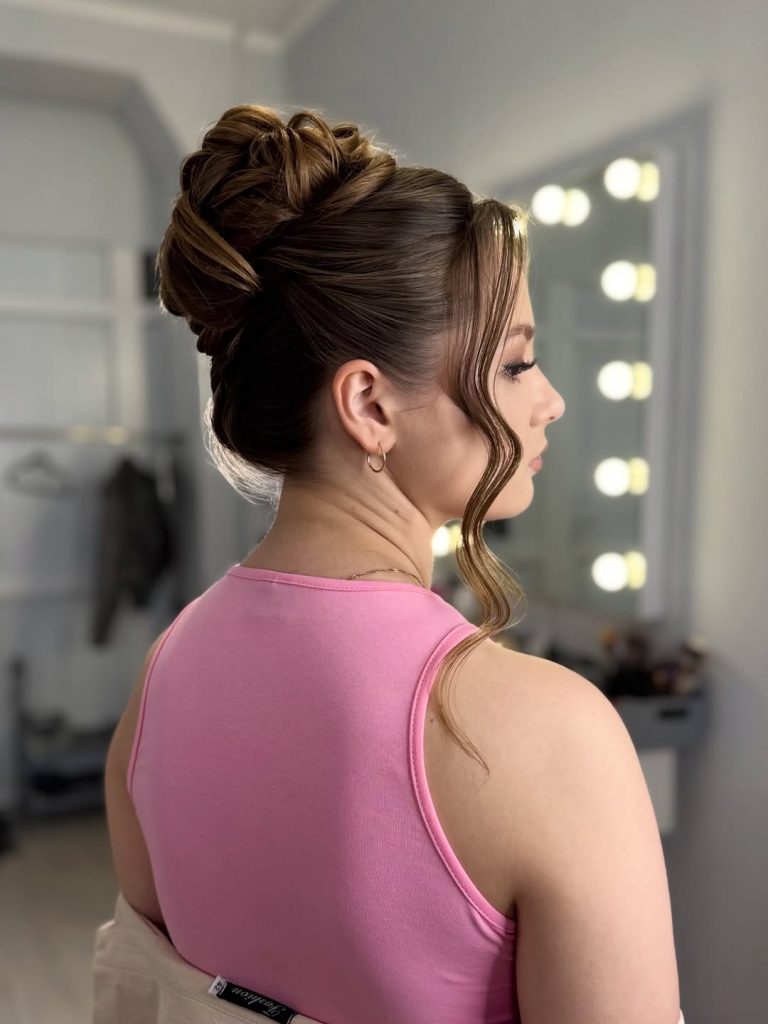 If you have thick, long women’s hair or layered long hair, this hairstyle maximizes that volume. It’s especially flattering for Curly hair or hair that holds texture well. What makes this cut special is how it balances drama with softness—bold from the back, gentle from the front. For women who want a refined yet fun updo, this style serves as strong inspiration.