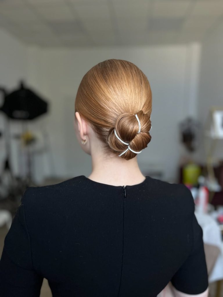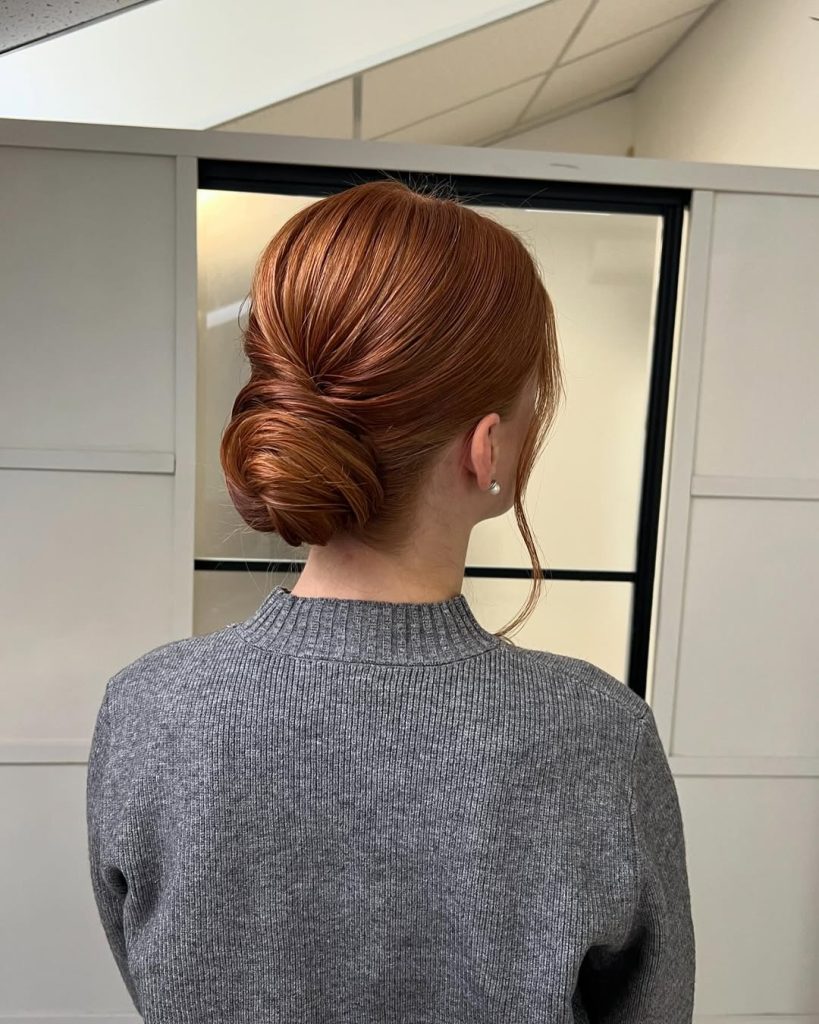 This sleek low bun highlights the richness of ginger tones beautifully. The hair is smoothed back into a compact, refined shape that feels understated yet striking. A single soft strand left loose at the front keeps it from feeling too formal, adding a whisper of softness.