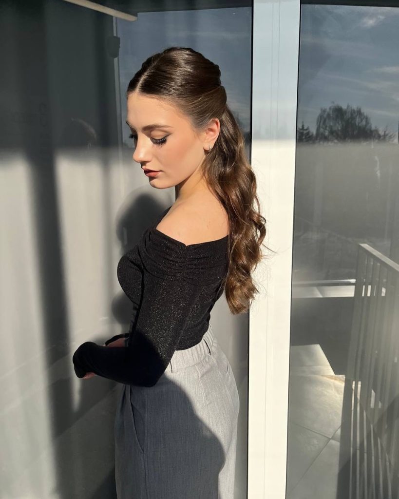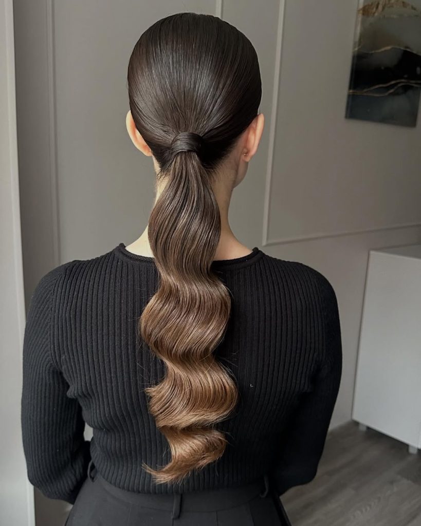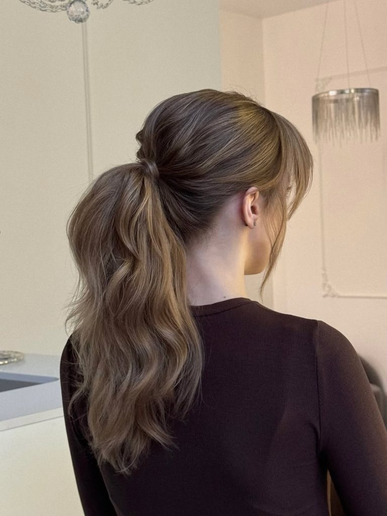 Ideal for women with long or medium hair and layers, this ponytail adds height without looking overly styled. A light tease at the crown and loose waves at the ends create a flattering silhouette. This ponytail is a timeless inspiration for women seeking simple yet elegant ideas that highlight length and shine.