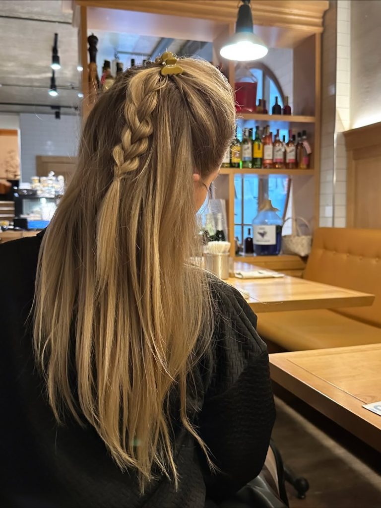 This half-up style with a braided accent and claw clip feels relaxed and effortlessly stylish. The braid adds subtle interest at the crown, while the remaining length flows naturally down the back. It’s casual enough for a laid-back Easter gathering but still thoughtfully styled.
