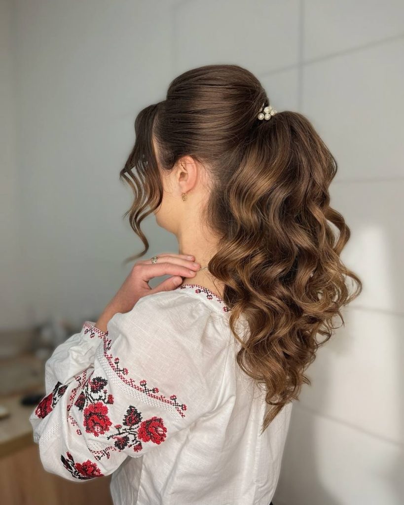 6. Romantic Curly High Ponytail with Pearl Accent