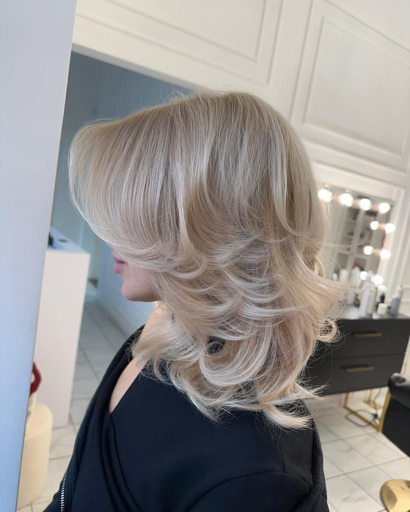 13. Layered Blonde Bob with Feathered Ends