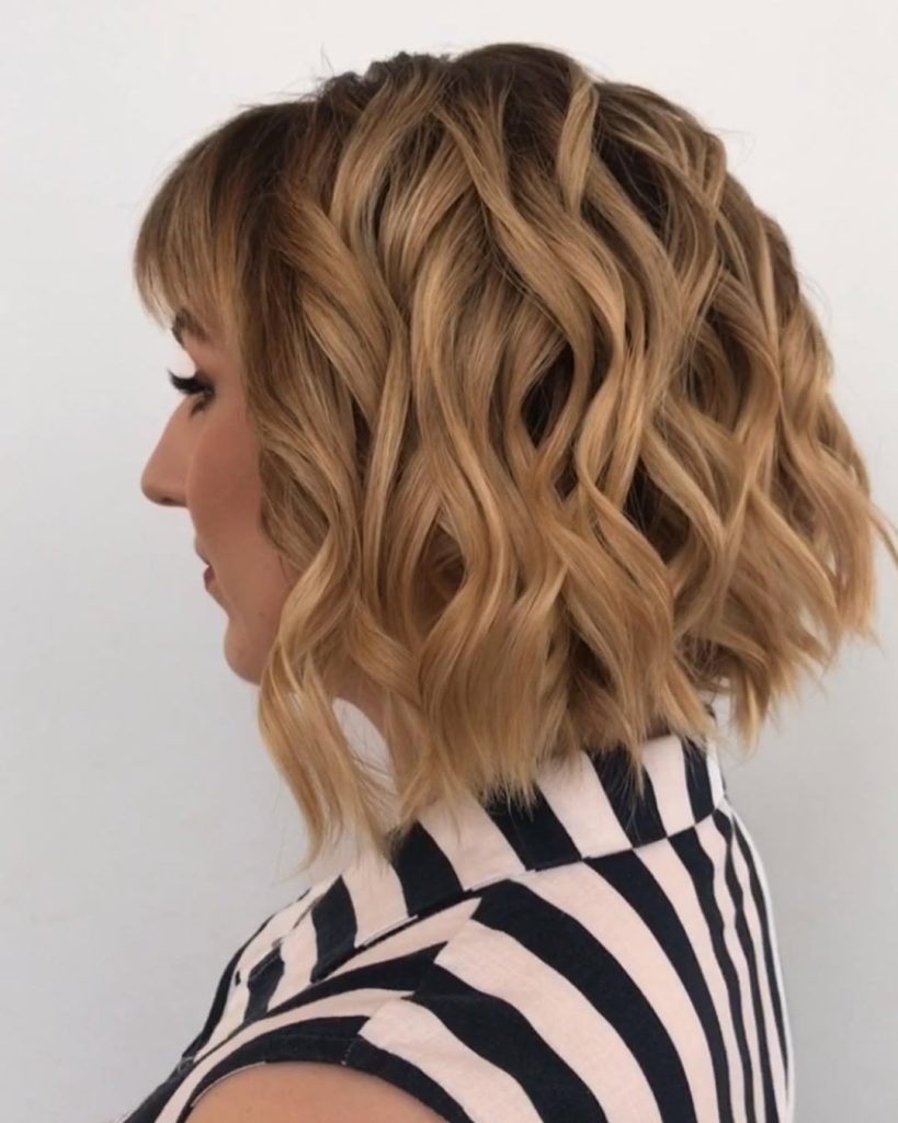 The wavy lob with bangs gives women who sport this hairstyle an element of play and fun with the bob haircut. In terms of look and feel, this hairstyle is perfect with its effortlessly messy look due to the wavy haircutswith bangs. This look works perfectly on wavy and fine hair.