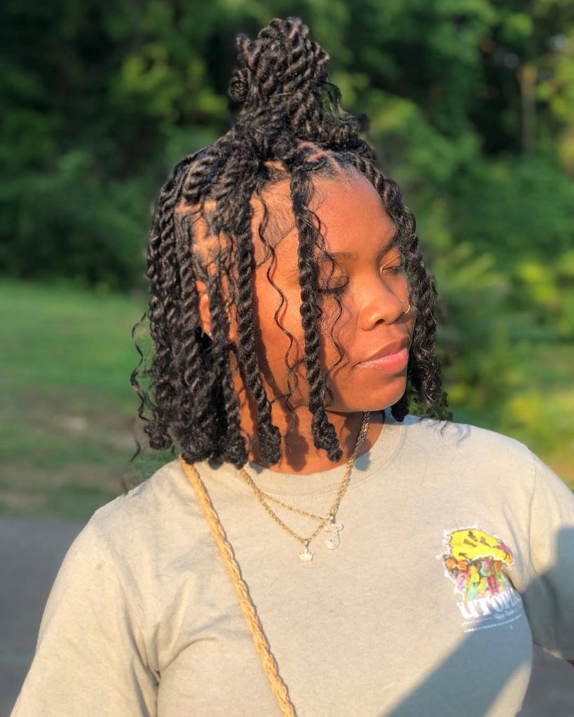 The half-up twisted hairstyle is perfect for those with short hair who are naturals. The hairdo has an element of fun and has been designed to be practical. The hair is twisted and has loose curls that give one’s face sun-kissed coverage with cute and carefree features.
