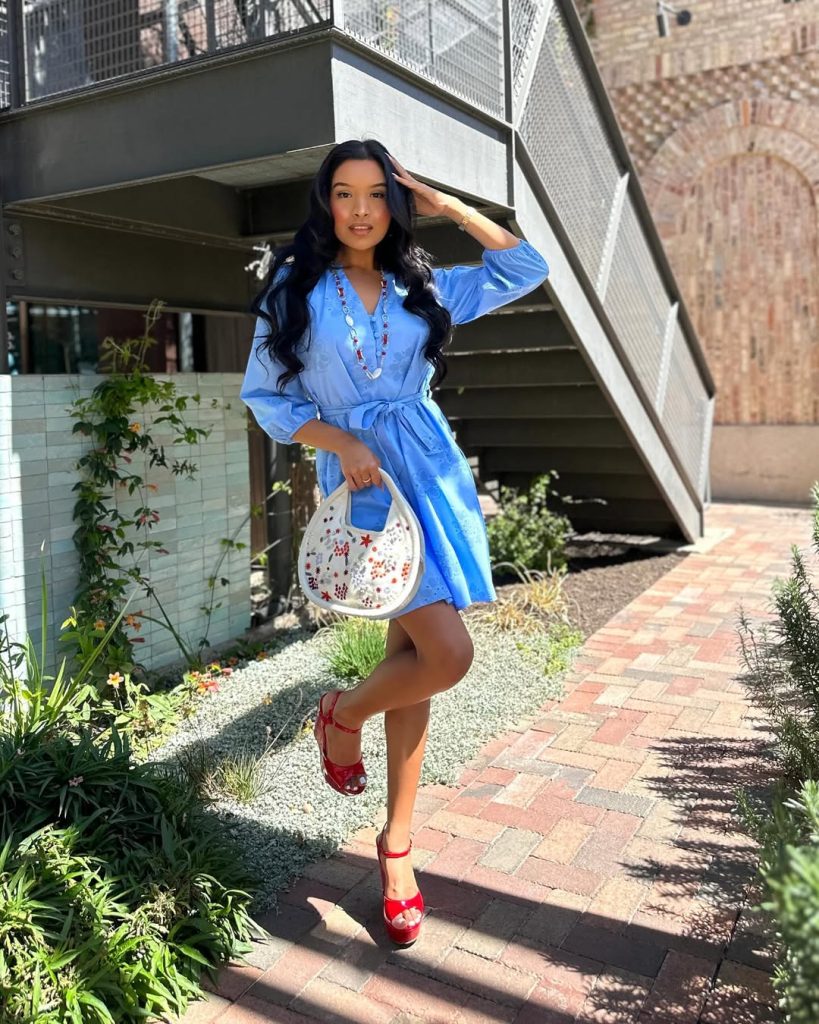 A belted sky-blue dress paired with bold heels creates an aesthetic that feels romantic yet grounded in everyday wear.