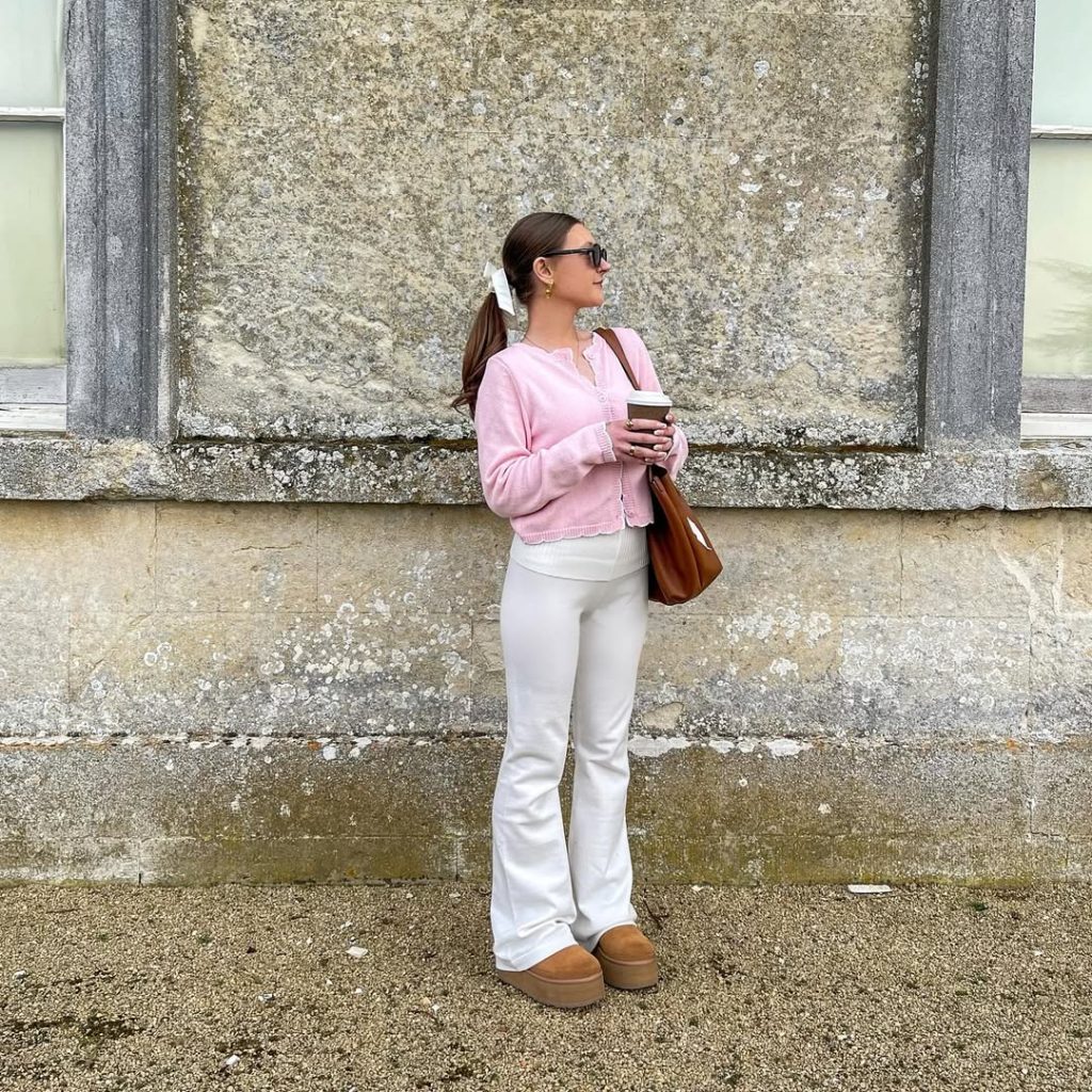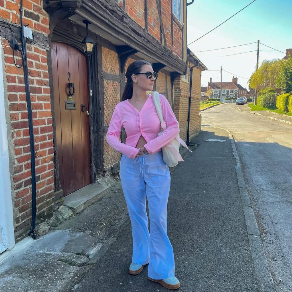 A cropped pink cardigan paired with pastel trousers leans into romantic light-spring dressing while remaining grounded and wearable.