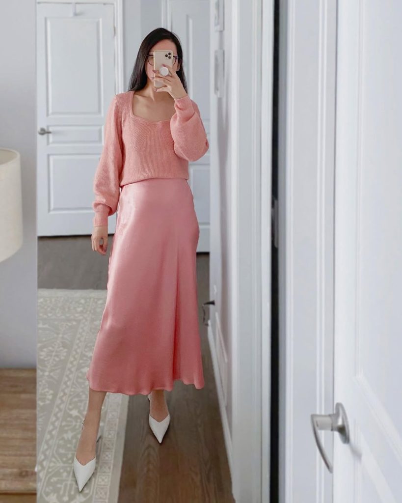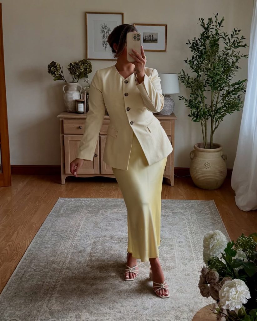 These heels are perfect for various occasions such as work settings, gallery visits, or brunch meetings. This look transitions well across seasons, making it relevant for a capsule wardrobe in fall and even early autumn. Add structure with a tailored blazer or tonal trench. Skip bold prints or contrasting shoes—they break the calm elegance that defines this palette.