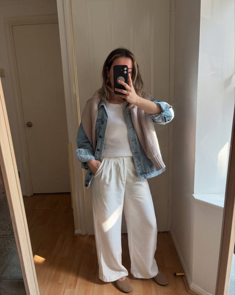 A light-wash jacket layered over soft knits and ivory trousers creates a relaxed silhouette perfect for real-life dressing.