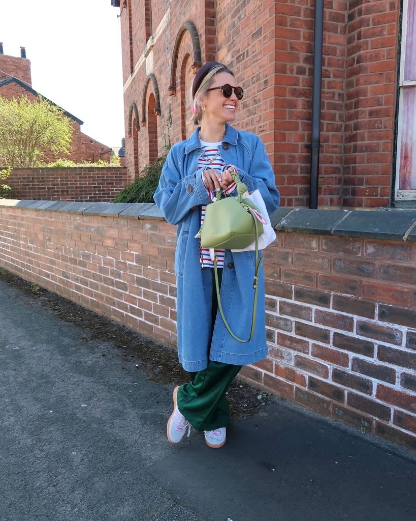 An oversized chambray coat layered over stripes and emerald pants shows how light spring palettes thrive through thoughtful color contrast.