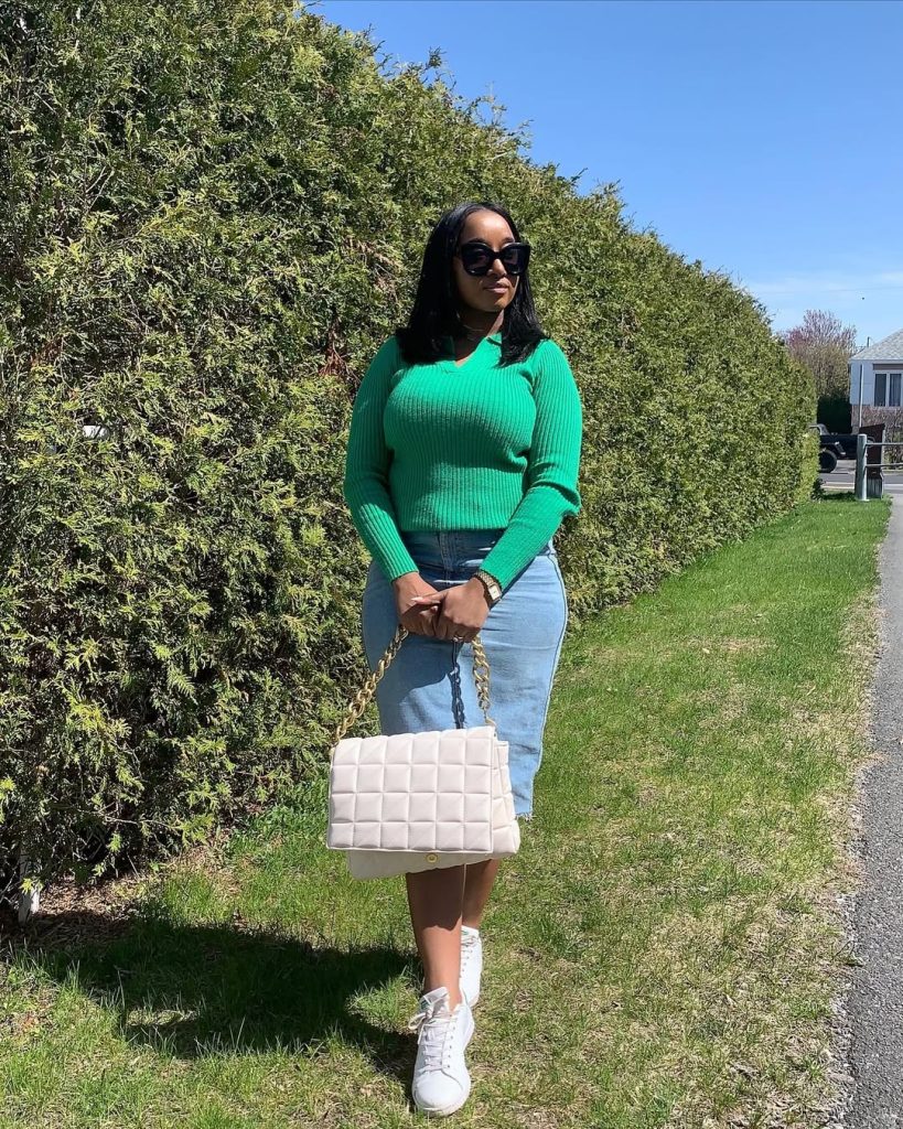 A bright emerald sweater energizes a denim midi skirt, creating a confident everyday look that feels crisp and modern.