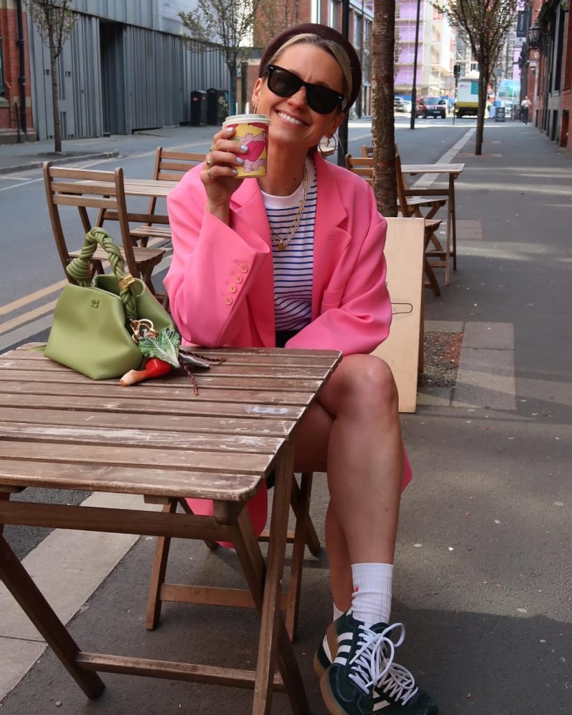 A tailored rose blazer layered over stripes proves light spring palettes flourish even during laid-back coffee breaks.