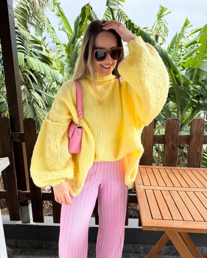 A fuzzy lemon sweater paired with pastel pink trousers delivers joyful color-blocking that feels playful yet wearable for bright spring days.