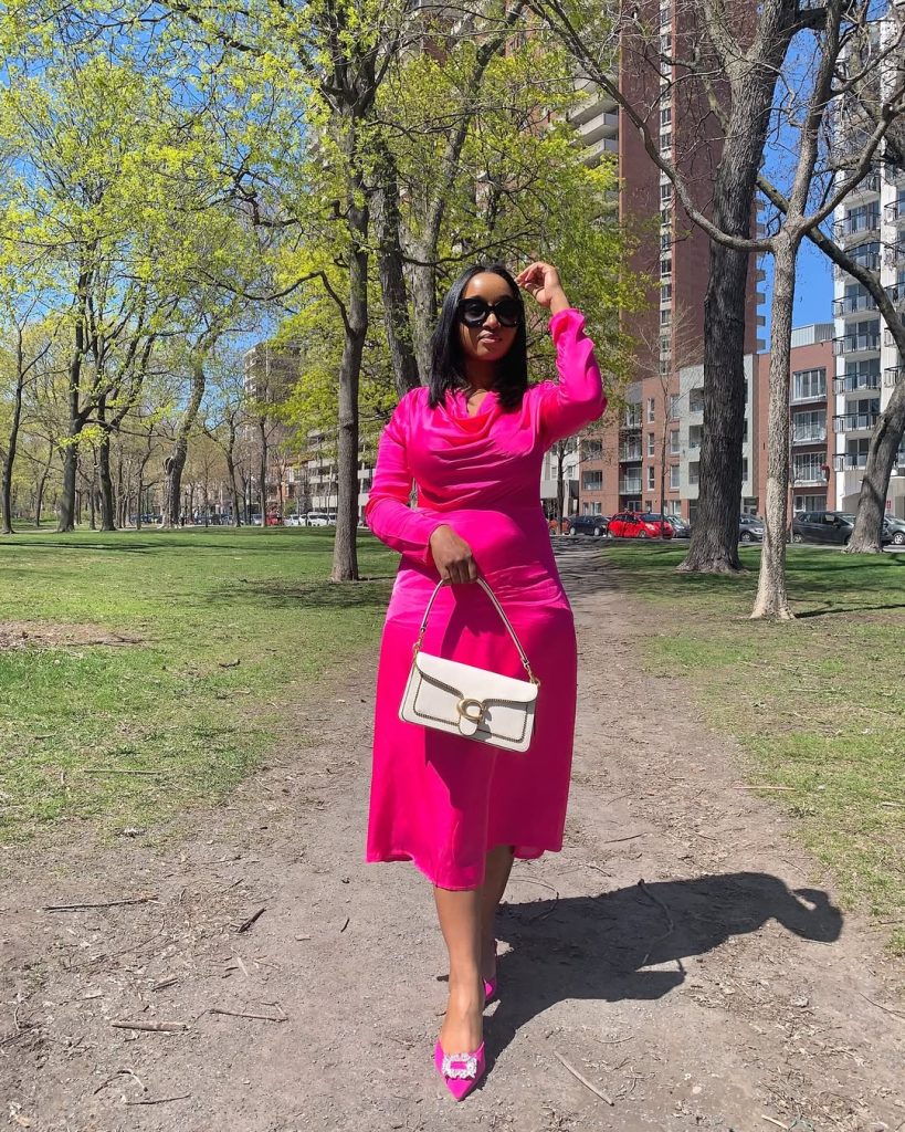 A bold magenta midi dress commands attention while staying elegant thanks to draped fabric and streamlined accessories.
