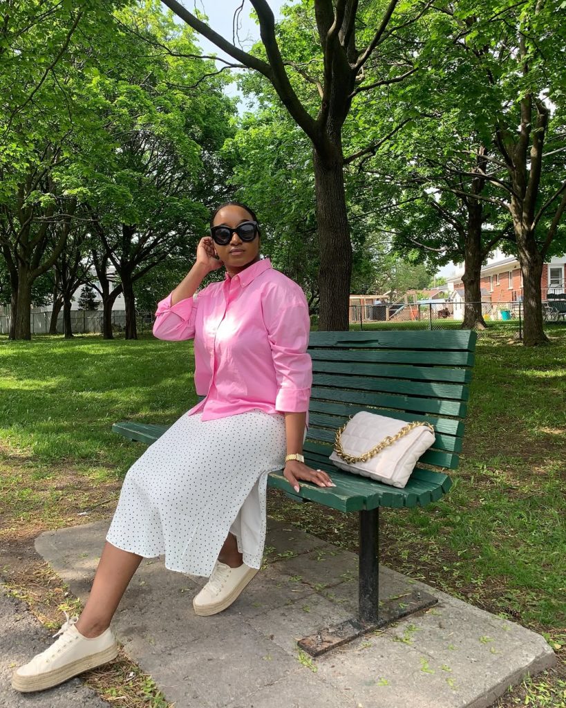 24. Pink Shirt and Polka-Dot Midi in the Park