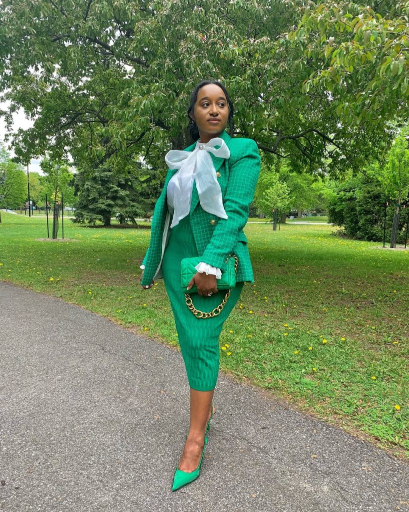 A tailored green tweed skirt suit paired with dramatic bows channels polished confidence with runway-ready flair.