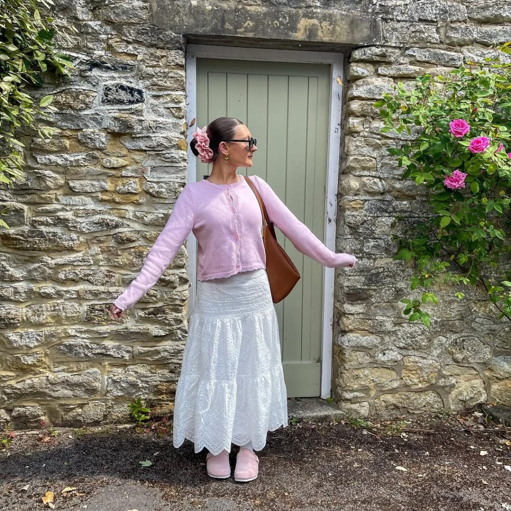 Soft pastels meet cottage-core elegance in this floaty spring look framed by stone walls and blooming roses.