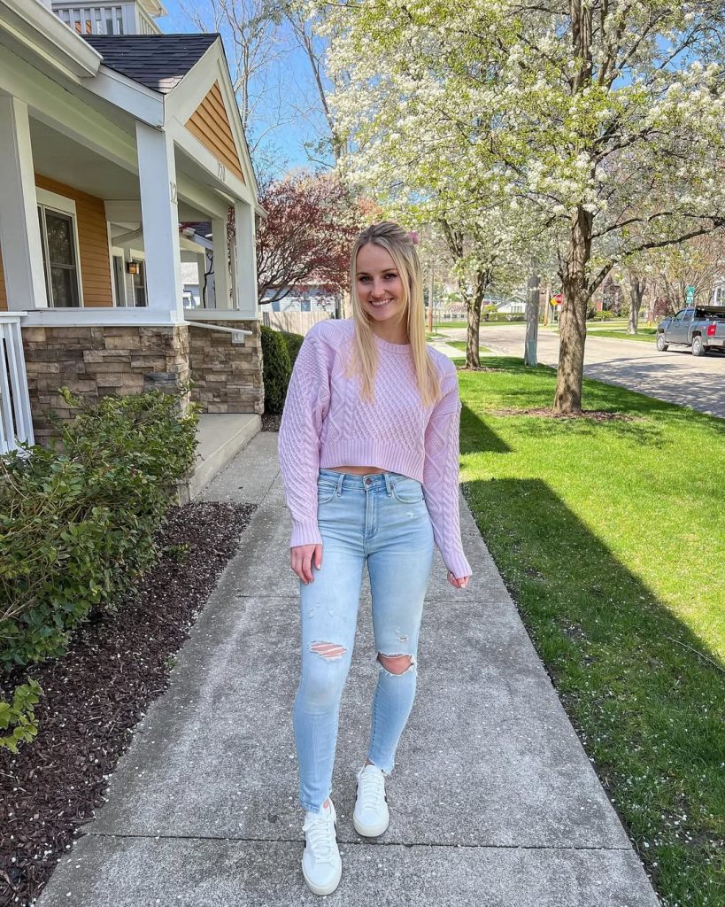 A cropped pastel knit paired with light-wash denim captures the youthful optimism often associated with Korean and Asian-influenced spring styling.