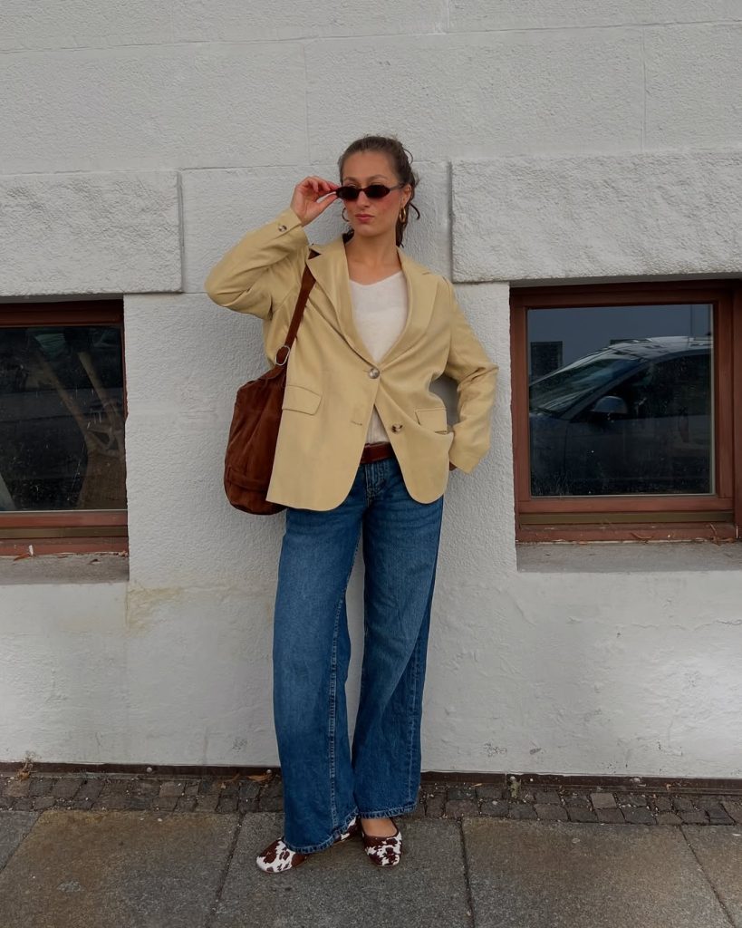 A buttery-beige blazer paired with wide denim channels effortless European street styles while staying firmly rooted in the light spring palette.