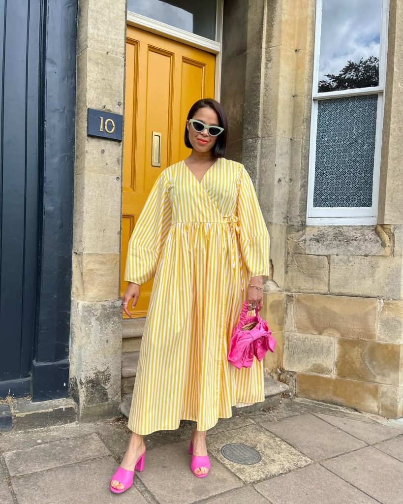 A striped wrap dress in soft yellow feels optimistic and fresh, the sort of look that defines light spring dressing in 2026.
