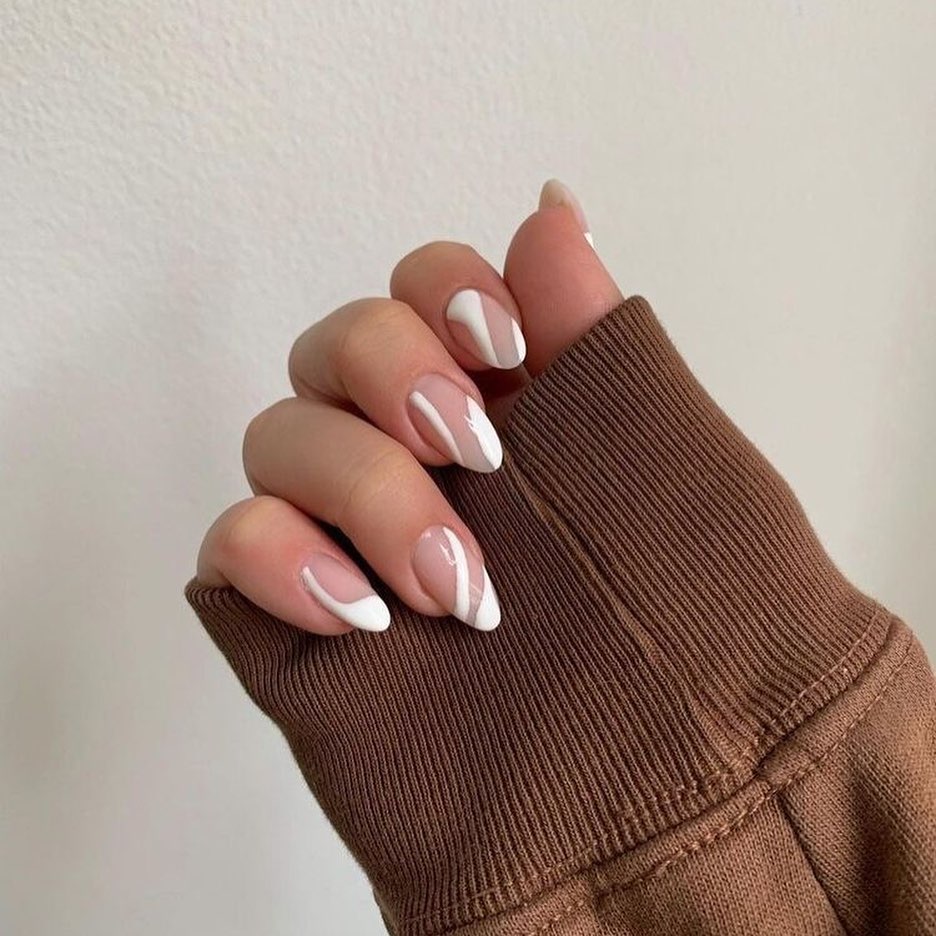 These delicate white swirls feel like a fresh take on French ideas. The nude base keeps everything light and airy, while the curved white tips add movement and softness. It’s Simple, elegant, and quietly beautiful—the kind of manicure that makes your hands look instantly refined.