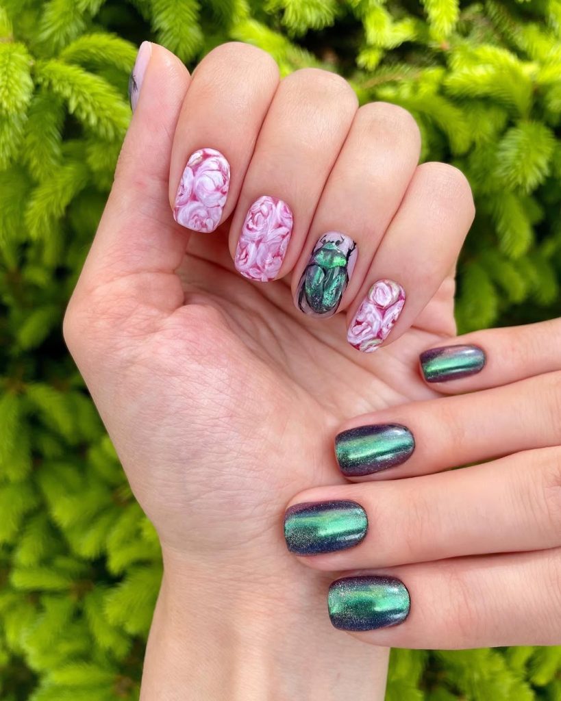 This set evokes the essence of a hidden garden, albeit with a unique twist. The deep, iridescent green chrome shifts beautifully in the light, while the delicate rose design and beetle-inspired Art create a bold focal point. It’s unexpected, slightly mysterious, and absolutely captivating. If you’re craving Ideas 2026 that feel artistic yet wearable, this manicure delivers serious Inspo 2026 energy.