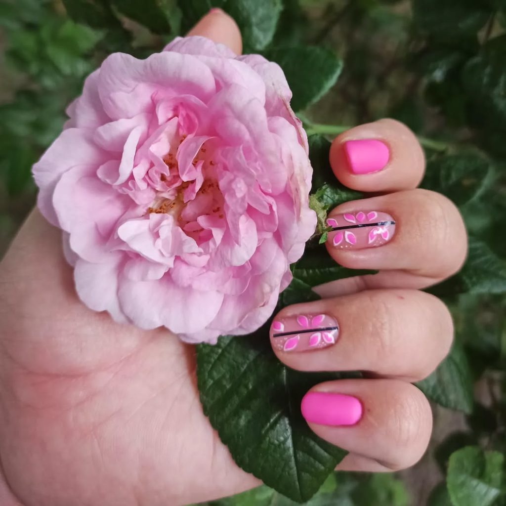 Soft matte Pink paired with tiny floral accents feels timeless and tender. Holding a blooming flower only enhances the romantic mood of this manicure. It’s Cute, feminine, and sweet without being overly dramatic—exactly the kind of simple inspo many women gravitate toward in spring.