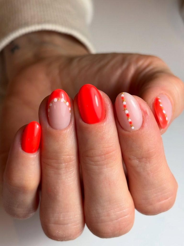 There’s something instantly energizing about this bold coral-red paired with delicate dotted accents. The glossy finish feels confident and clean, while the subtle detailing keeps it from looking too basic. It’s Simple but never boring—exactly what May calls for.