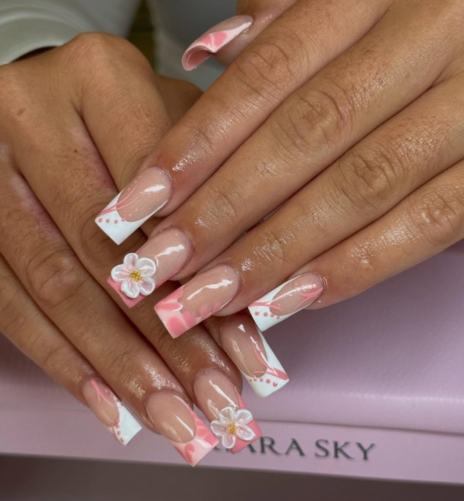 There’s something undeniably elegant about soft blush paired with crisp white tips and delicate 3D florals. The balance between structure and softness gives this Design 2026 a bridal, romantic feel that still works beautifully for everyday spring moments.