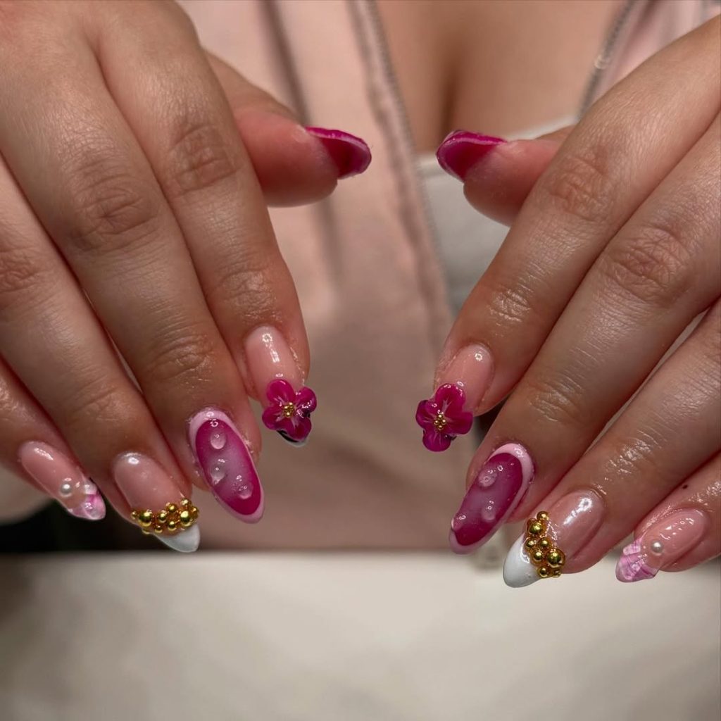 Rich berry tones, glossy finishes, and sculpted floral accents give this manicure a bold yet romantic personality. The deep Pink shades feel luxurious, while gold details add a touch of glow that catches the light beautifully. It’s dramatic, confident, and full of 2026 attitude.