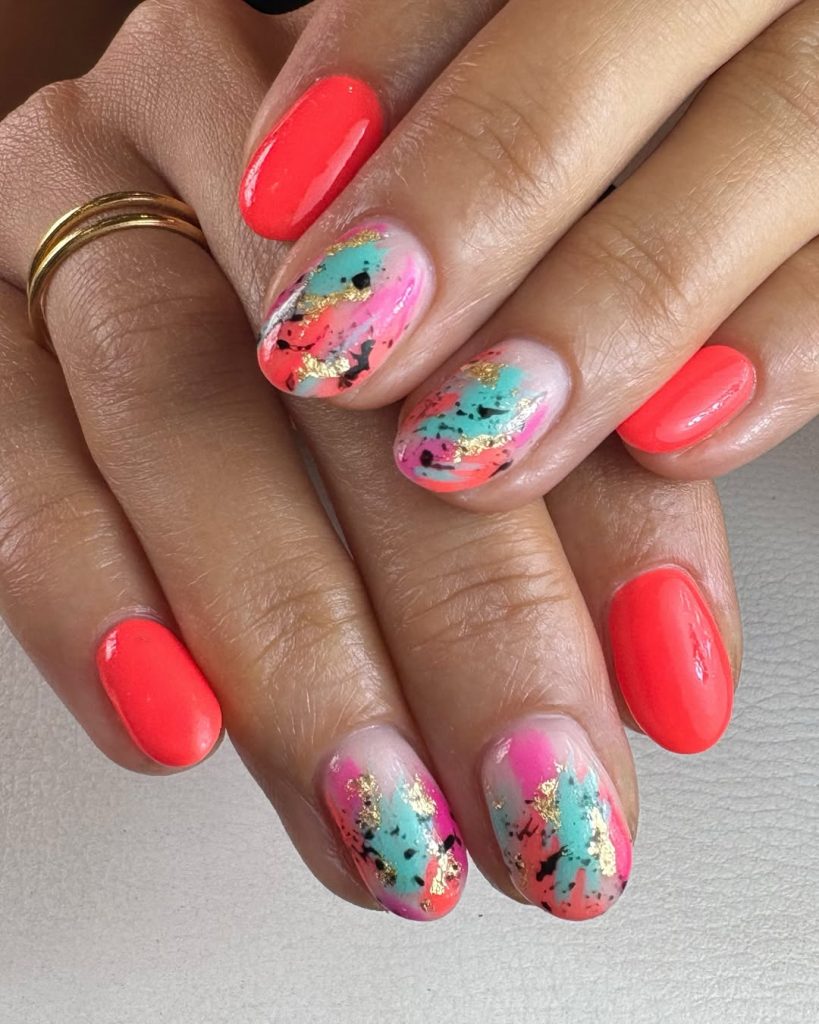 This set is pure creative energy. Vibrant coral nails are paired with abstract splashes of turquoise, gold, and black, creating a mini canvas effect. It exudes a modern, artistic, and slightly daring vibe, embodying the Inspo 2026 trend that transforms your hands into a striking piece.