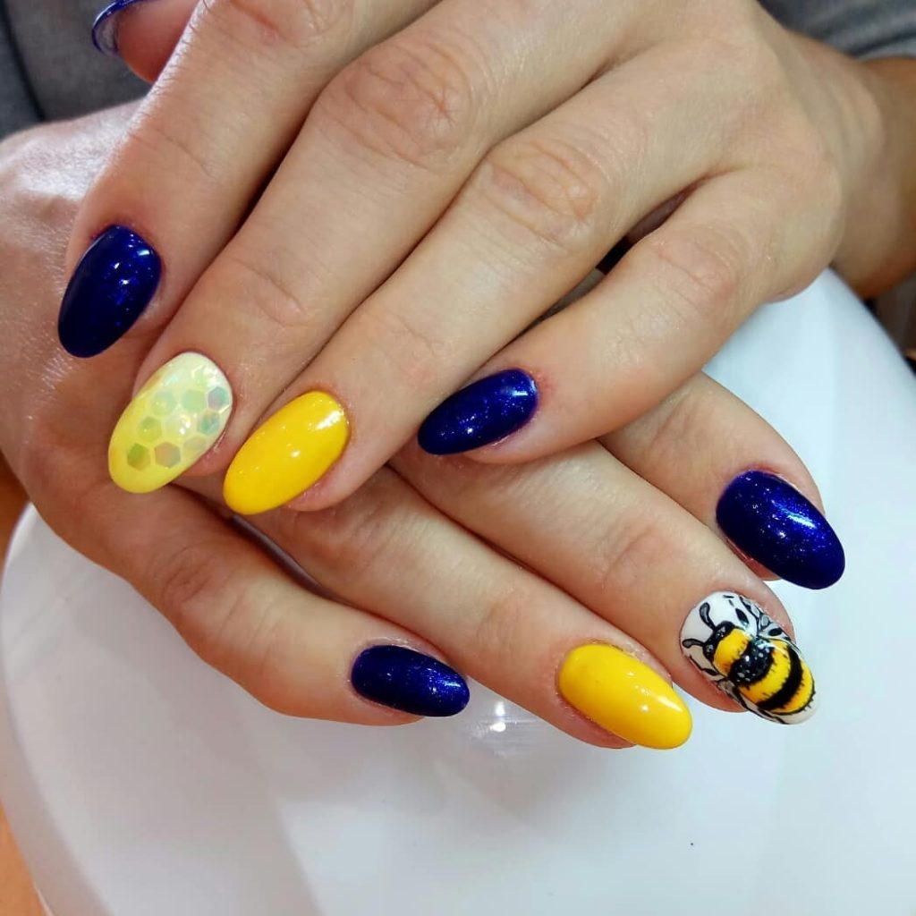 This manicure is pure personality. The deep sparkling blue paired with sunny yellow feels energetic and joyful—like a little burst of happiness every time you move your hands. And that detailed bee artwork? It adds charm and a playful twist that instantly makes the set memorable. If you’ve been searching for Inspo almonds for a bit of fun, this collection collection is it.
