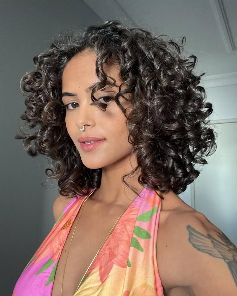 There’s a softness to this rounded bob that feels instantly approachable. The curls fall evenly around the face, creating a harmonious shape that feels calm, warm, and quietly stylish. It’s one of those ideas that doesn’t demand attention but naturally draws it, especially when paired with a relaxed smile and confident posture.