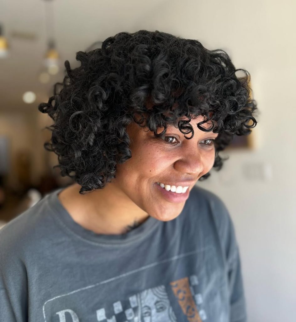 This cut is ideal if you want something easy and low tension. It suits tight curls and works especially well for women over 50 who prefer structure with softness. Styling is simple—just define the curls and go. It’s a super practical choice that still feels polished enough for a wedding or formal event.