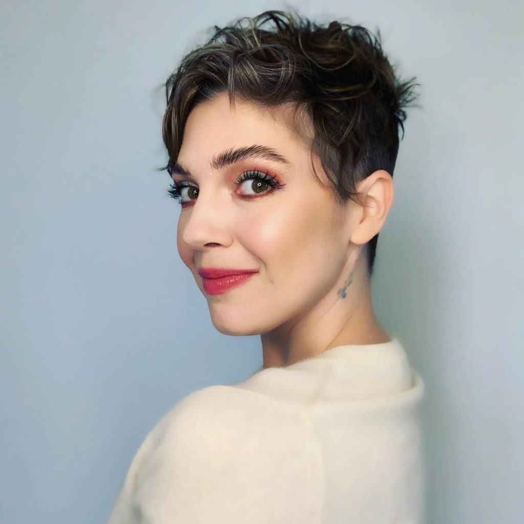 This pixie has a crisp, confident energy that feels refreshing. The clean taper keeps the silhouette sharp, while the curls on top soften the look and add movement. It feels bold yet approachable, perfect for women who enjoy a modern, no-nonsense style with personality.
