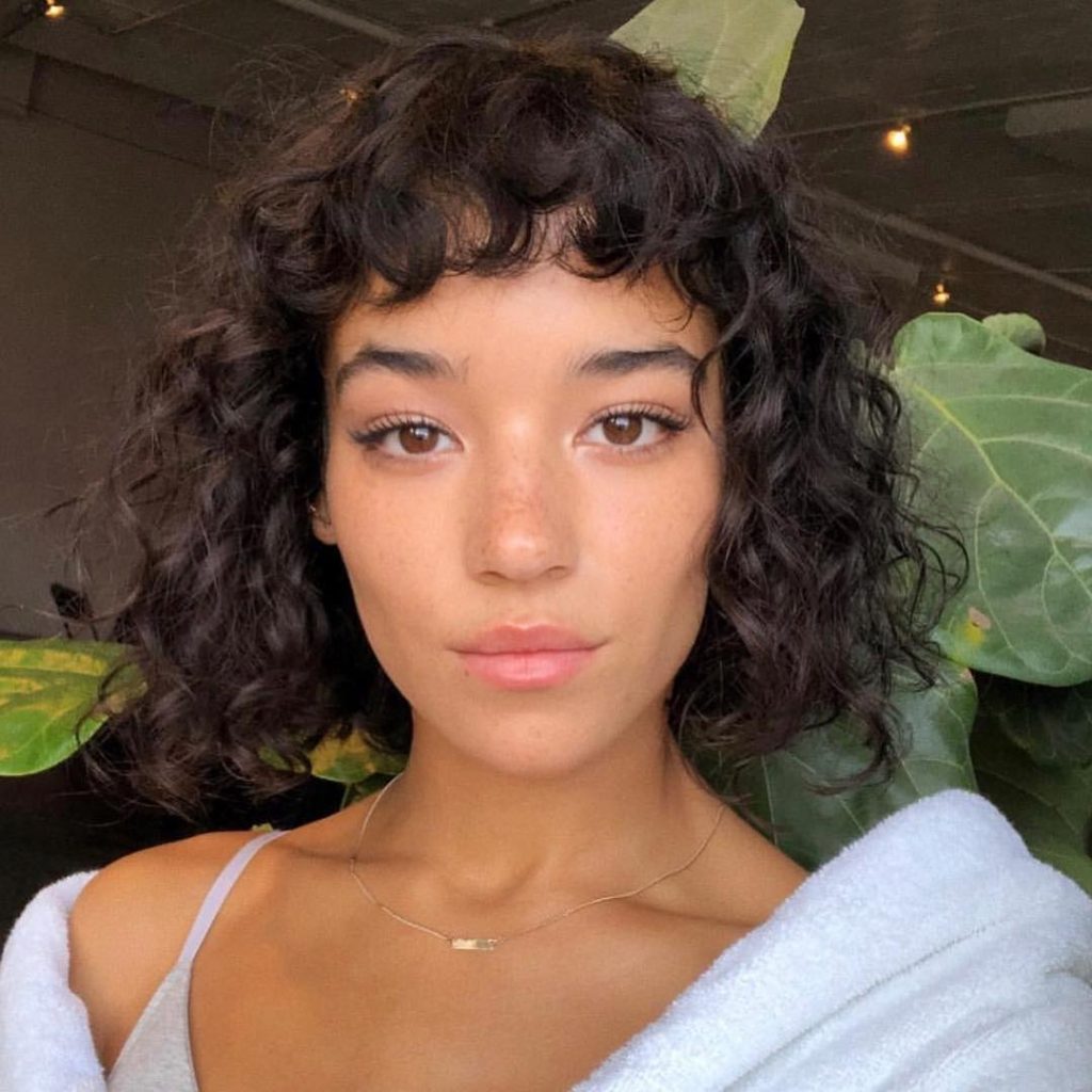 There’s something quietly charming about this look. Soft micro bangs add a playful, artistic, and whimsical touch, while the curly bob softens the look and keeps the overall shape balanced and relaxed. It feels fresh and almost crisp with a thread of vintage that gives the overall feeling some boldness. The cut is one of those cute ideas that feels very personal and almost makes a statement.