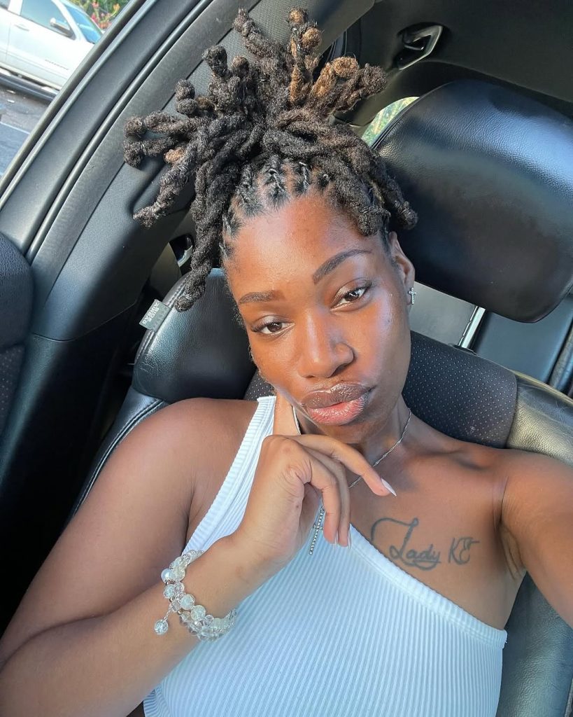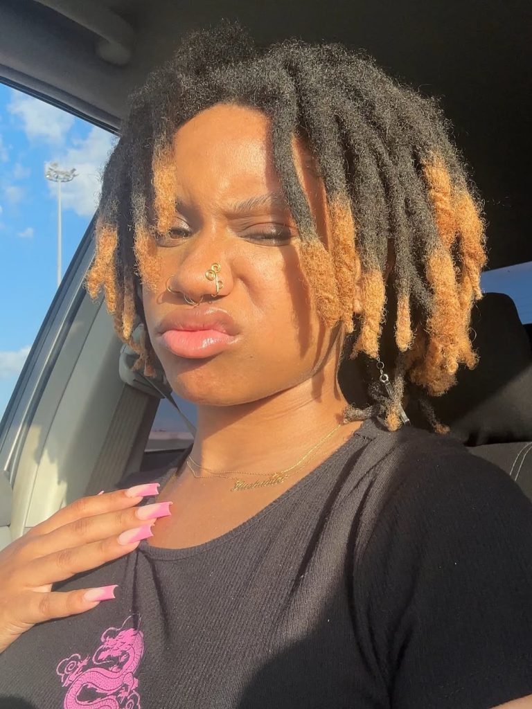 This two-tone short loc look feels enjoyable, expressive, and full of personality. The lighter ends bring attention to the movement of the locs, giving the style a playful, youthful energy without feeling immature. It’s one of those looks that feels spontaneous, like you woke up already in a positive mood. There’s confidence in embracing contrast, and this style wears it beautifully.