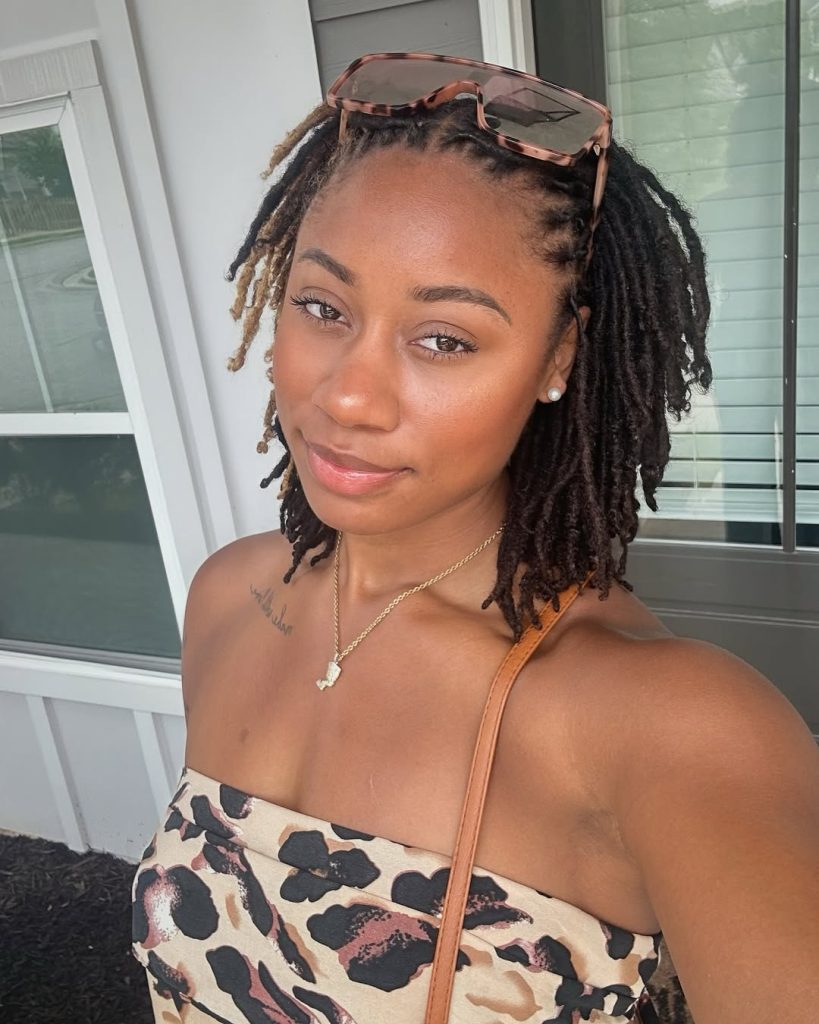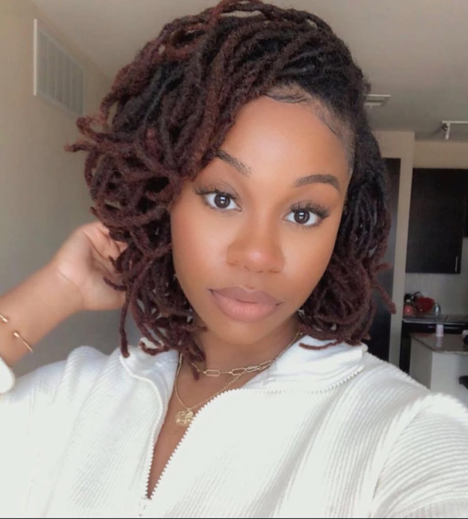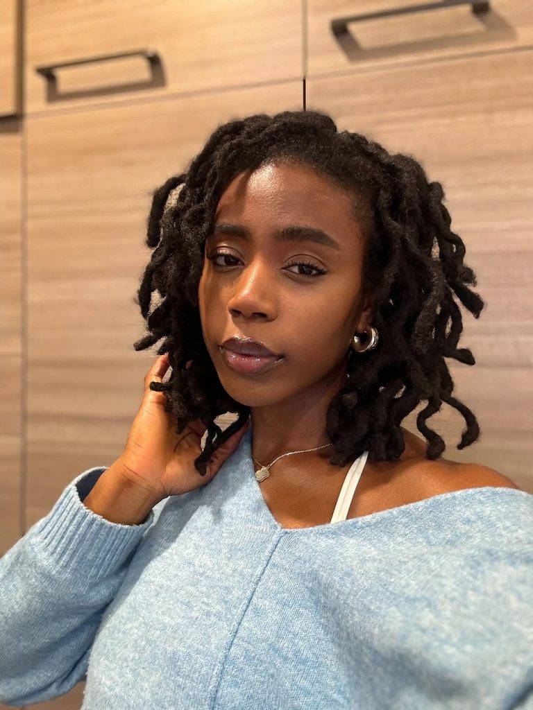 This look gives off effortless confidence with just a hint of playfulness. The subtle highlights add dimension, while the short loc length keeps everything feeling fresh and modern. It is the type of style that appears excellent on the move—effortlessly casual yet deliberately curated—conveying a sense of spontaneity without sacrificing sophistication, resulting in an effortlessly polished appearance.