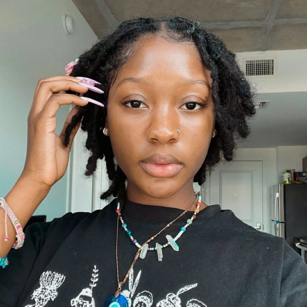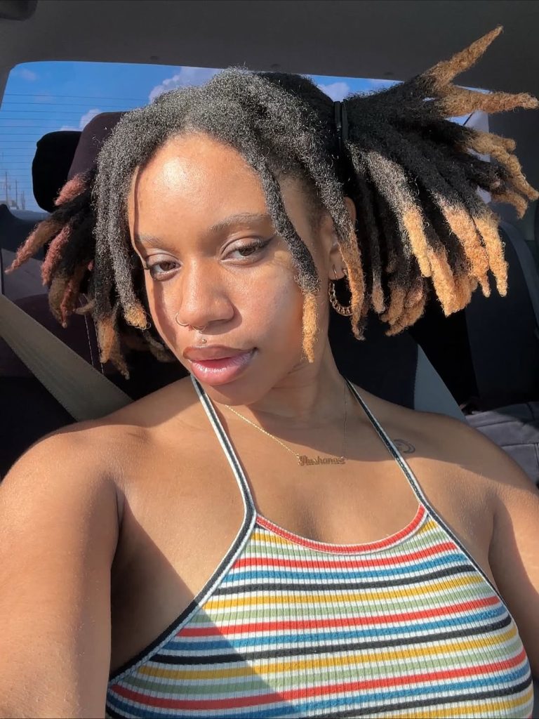 Overall, this style brings a feeling of joy and ease. Having the short, lightened locs pulled into soft, carefree pigtails embodies a youthful spirit and playful charm. Having a hairstyle this refreshing is a rare occurrence, as this look embodies summer and freedom and is perfect for moments with active hair and carefree ambience.