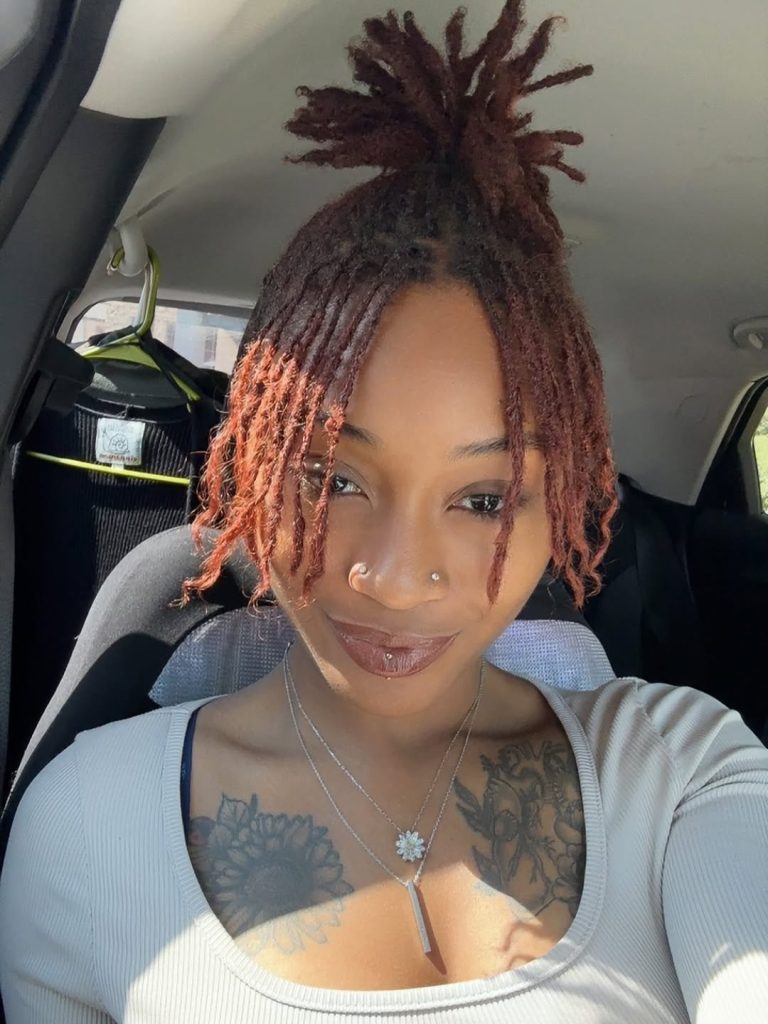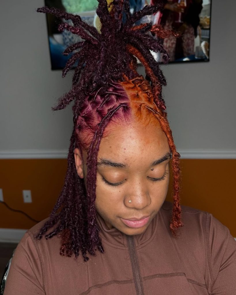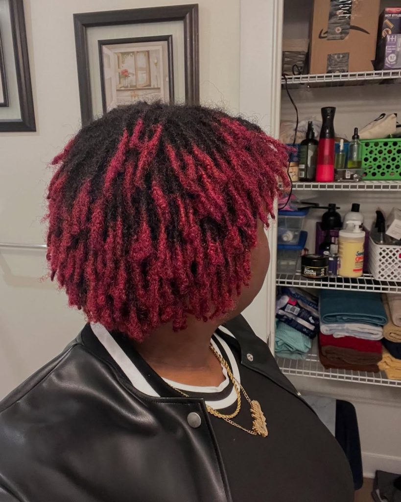 What makes this cut stand out is how the color enhances the shape of the locs. It works beautifully for women with dreadlock-style locks who want extra dimension without added hair. Keeping the locs moisturized helps the color stay vibrant and the texture soft. Compared to natural-only looks, this style offers a bit more edge while keeping the same manageable length.