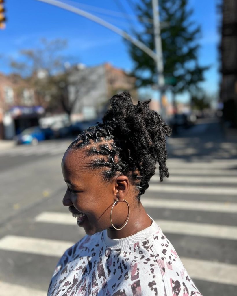This high-starting updo brings instant energy and confidence. The short loc ends add texture and personality, while the lifted shape draws attention upward, giving the face a bright, open look. It feels enjoyable, expressive, and bold without being over the top. The result is the kind of style that makes you smile when you catch your reflection, especially on days when you want to feel powerful and self-assured.