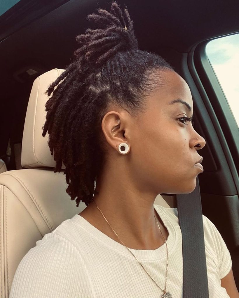 This high short loc updo gives an instant feeling of power and taking command of the situation. The defined roots bring balance to the look, and the lifted shape is a wonderful way to showcase the attractiveness of the face. The look is bold but not too formal, so it’s perfect for occasions where you want to feel confident and in control. Wearing short locs is energizing and uplifting; they convey a positive vibe through a person’s walk and posture, creating an overall uplifting mood.