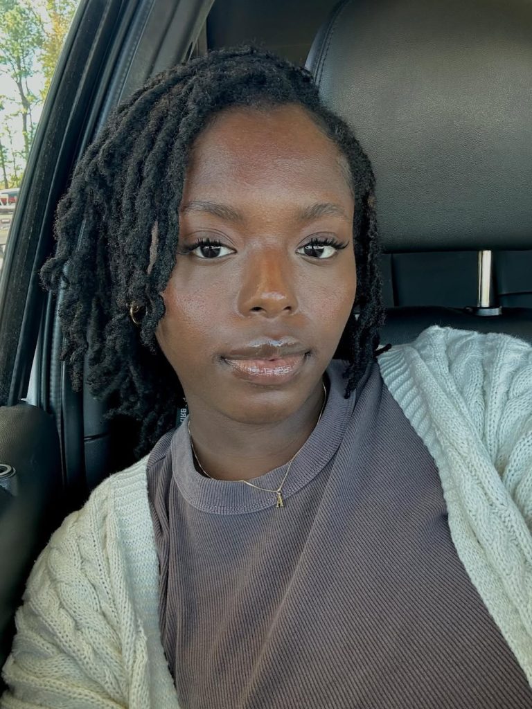 This half-up style strikes the perfect balance between casual and put-together. The small bun at the crown adds height and shape, while the rest of the short locs fall naturally around the face. It feels relaxed but confident, like an everyday look that still carries intention and style.