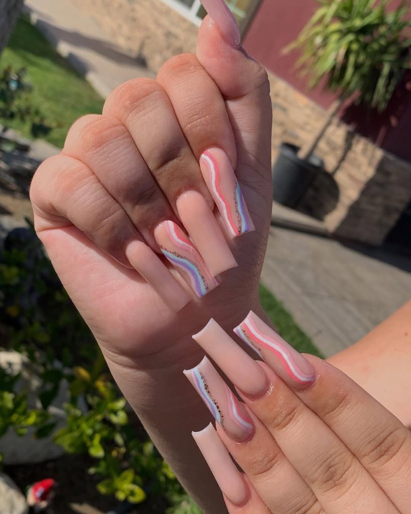 There’s something effortlessly chic about a creamy nude base paired with delicate pastel waves. This look feels like a warm spring afternoon—subtle and polished, but with just enough Art to make people look twice. The flowing lines almost mimic soft fabric in the breeze, giving these Square nails a graceful, feminine mood that feels perfectly aligned with 2026 Ideas and fresh seasonal Inspo.